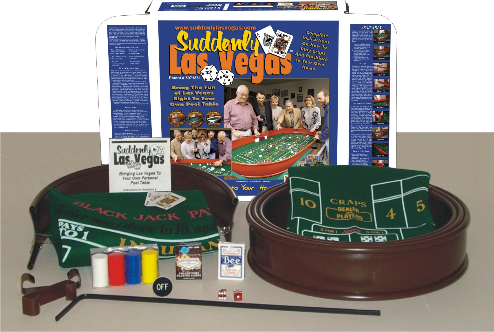 • One 44" X 88" felt gaming mat (crap game on one side, blackjack on reverse) • One 5" high adjustable barrier (available in burnt orange, white, or brown) • Backstop for those who tend to throw the dice off the table (available in burnt orange, white, or brown). • Two 5" plastic barrier clamps (available in burnt orange, white, or brown) • Two Las Vegas casino dice • One On/Off Marker • One Rake • One decks of cards • One box of poker chips (100 count) • Assembly instructions and game rules • Storage carton